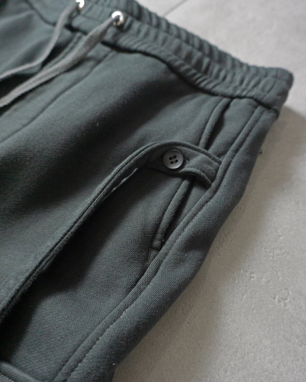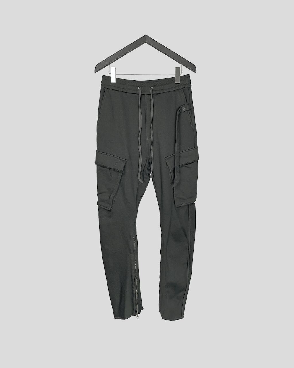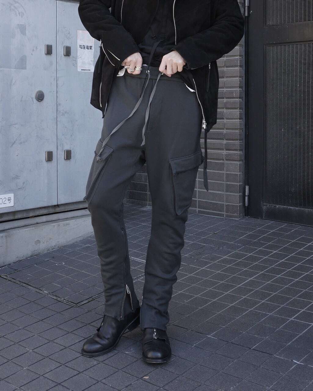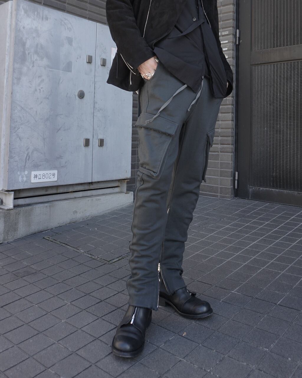 Cargo pants made from sweat fabric that has undergone a product dyeing process to express its unique texture and color tone. Featuring three-dimensional patch pockets and flaps, it exudes a wild impression overall while maintaining a slim silhouette to balance it out. With a slightly deep rise and ample room around the thighs, it is tapered towards the hem but equipped with long zippers, allowing for transformation into a flare silhouette. A new icon strap is attached to the left pocket, while discreet Y embroidery adorns the flap of the right pocket. While remaining a universal cargo pants style, attention to detail, color, and material sets it apart, aiming for differentiation.
