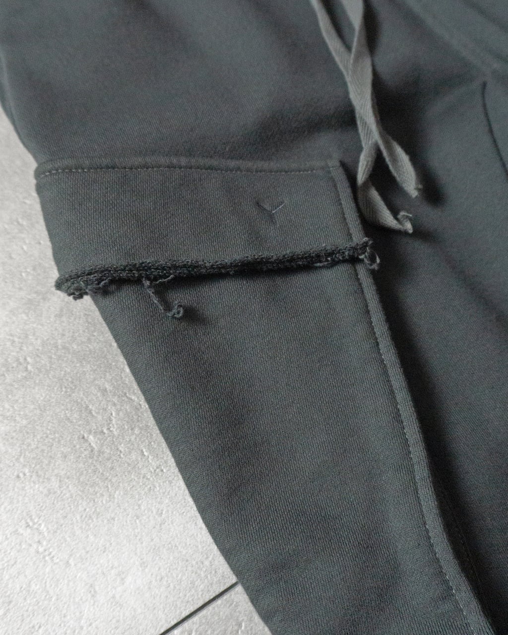 染め加工を施して独自の質感と色味を表現したスウェット生地のカーゴパンツ。立体的なマチポケットとフラップで全体的にワイルドな印象を与えつつも細身のシルエットでバランスを整えている。股上はやや深く腿周りにはゆとりあり。膝から裾にかけては細身に仕上げているが長いジップを備えており、フレアシルエットにも変形可能。左ポケットには新たなアイコンのストラップを装着。右ポケットのフラップにはY刺繍がさりげなく入る。普遍的なカーゴパンツながらも細部や色味、素材にこだわることで差別化を図った。