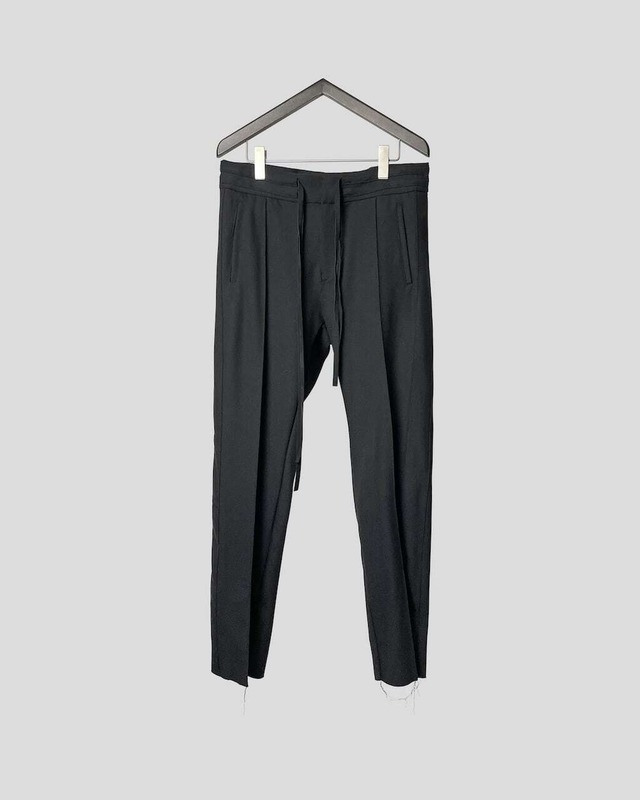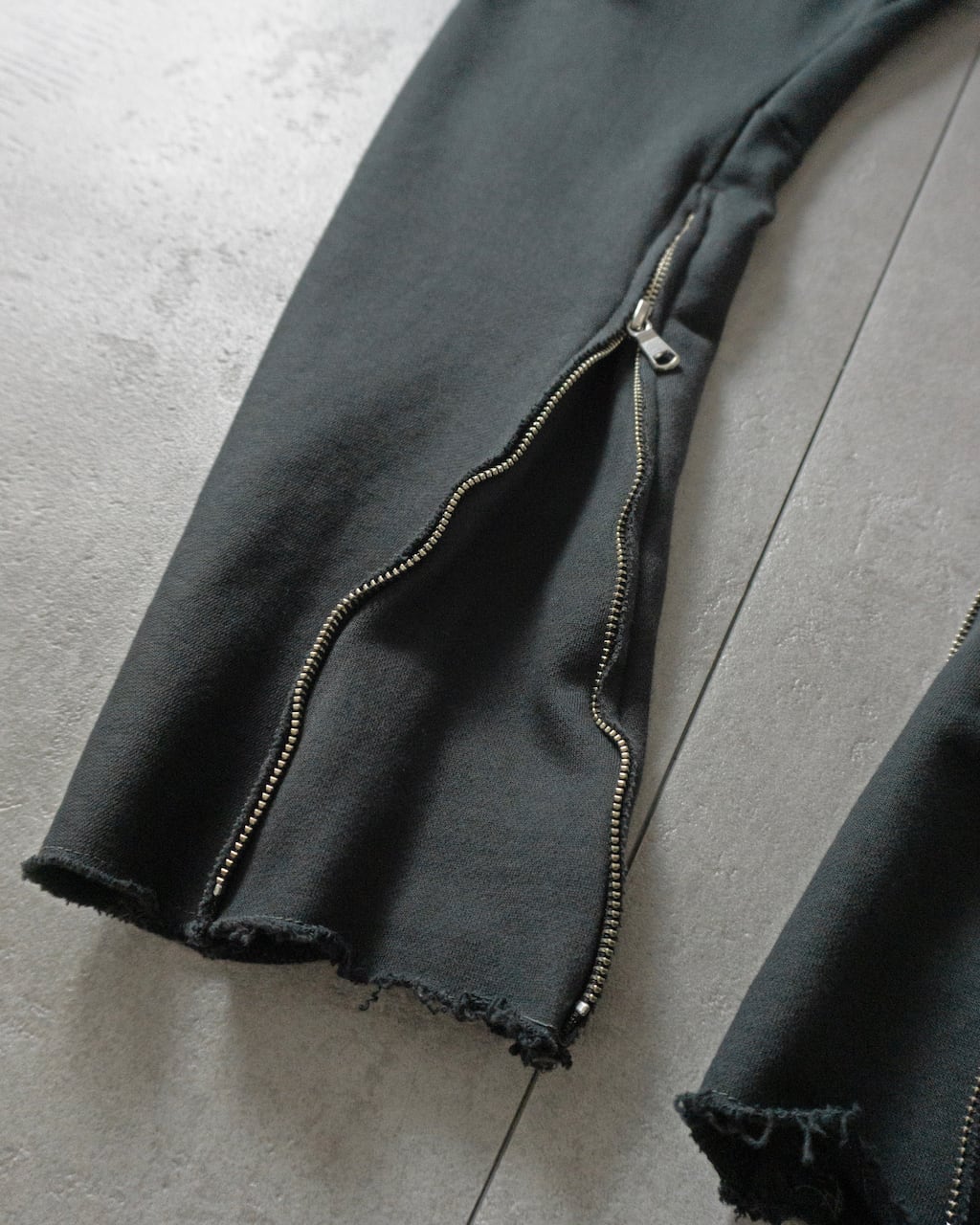 Made from heavy jersey with reduced sagging characteristic of sweat fabric, providing high durability and stiffness. It achieves a clean silhouette without overly accentuating the shape of the legs. Crafted with dyeing processing after sewing to add a sense of craftsmanship and grunge. The fabric's strength allows for prolonged wear, with the potential for aging changes, including a faded dye effect, taken into consideration.