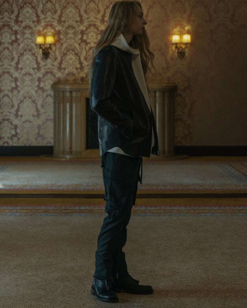 裏毛特有のへたりを抑え強度の高いハリをもたせたヘビージャージ。足の形を拾いすぎず綺麗なシルエットを実現。縫製後に染色加工を施しクラフト感とグランジ感を加えている。生地が強い分長くご着用可能で、染め落ち感などを踏まえ経年変化も見込める一品。